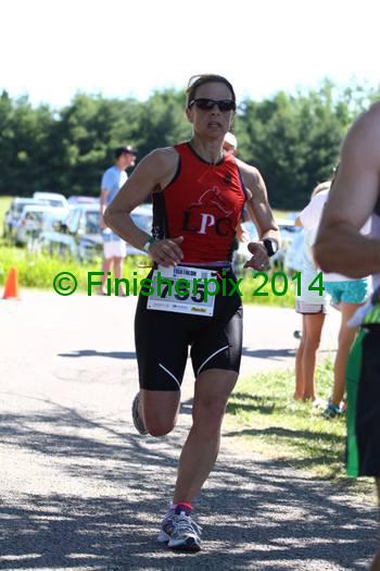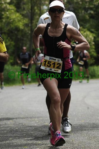 My legs felt great getting off the bike and I got back to transition happy that I hadn’t overdone it for the run (actually, if I recall correctly, this had me worried maybe I didn’t bike hard enough…ah, always looking for more!). The run is an out and back and a great course for a nice negative split as its a bit downhill on the return. Here I am rounding one last corner to the finish line; my legs were definitely feeling it at this point.