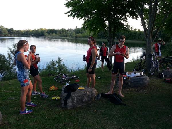 At the Wasaga beach sprint triathlon (two weeks before the Ontario Women’s triathlon) I had two fairly pathetic transitions and a slow run following one of my best bike splits yet. It was a useful rust-buster race and I think it played a huge part in making sure I was extra-prepared to race smart in Georgina! My goal for the Ontario Women’s triathlon was to put together a solid race from start to finish. I used my warm-up to review T1 and T2 (remember where your bike is, Robinson!) and to do a short spin with mount/dismount line practice, before listening to a warm welcome from Paolina Allan (red jacket) and pre-race instructions from John Salt.